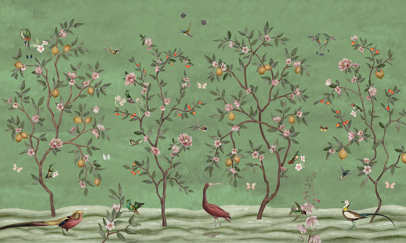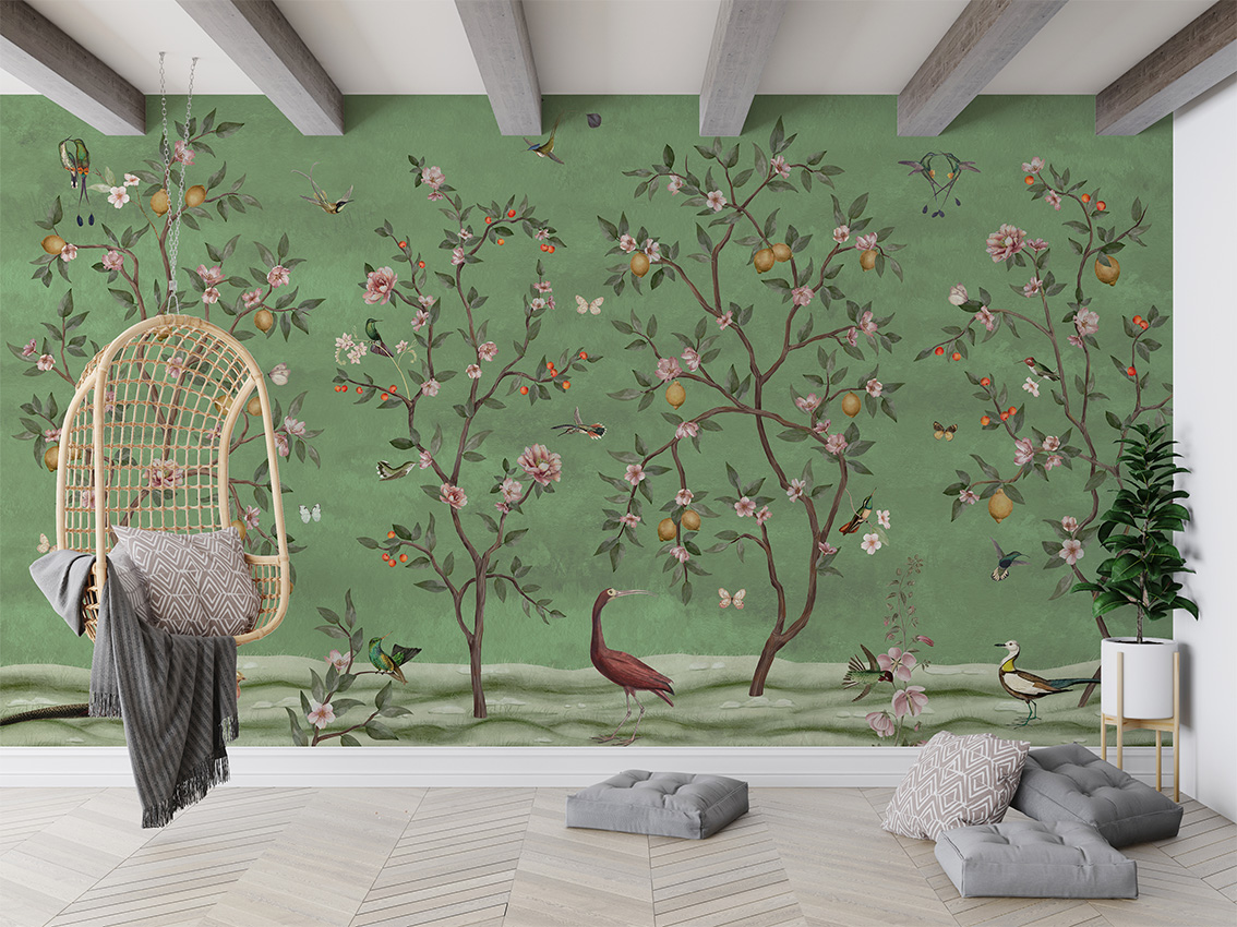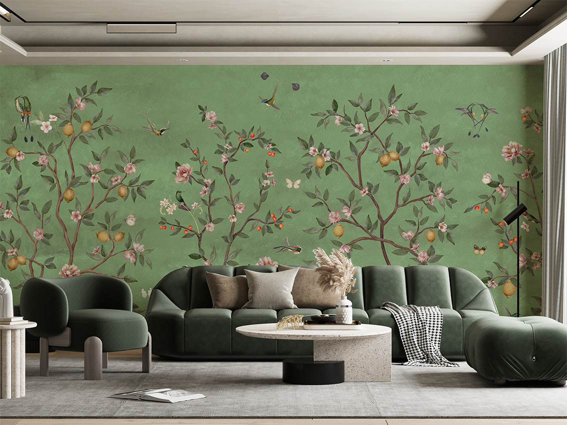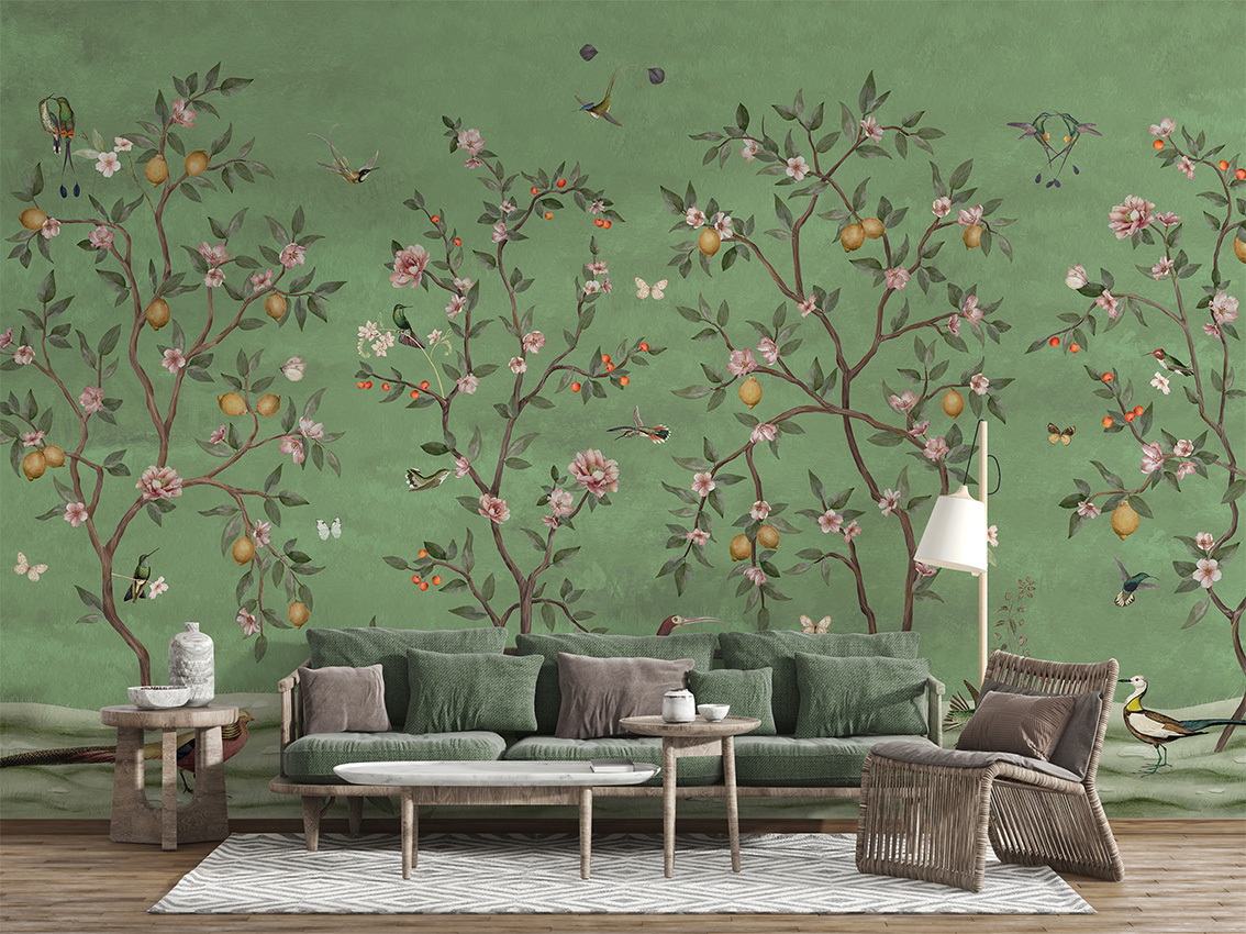 Zöld chinoiserie fotótapéta citromfával és egzotikus madarakkal, mely az orientális képzőművészet mintáit dolgozzák fel kellemes árnyalatokban. A madarak és virágos növények harmóniát és elegáns szépséget tükröz és igazi WOW élményt teremt otthonodban.