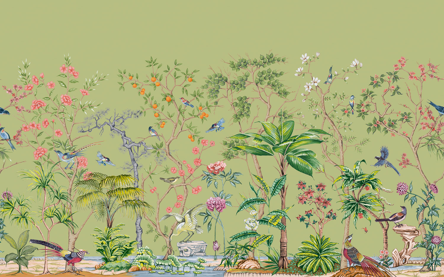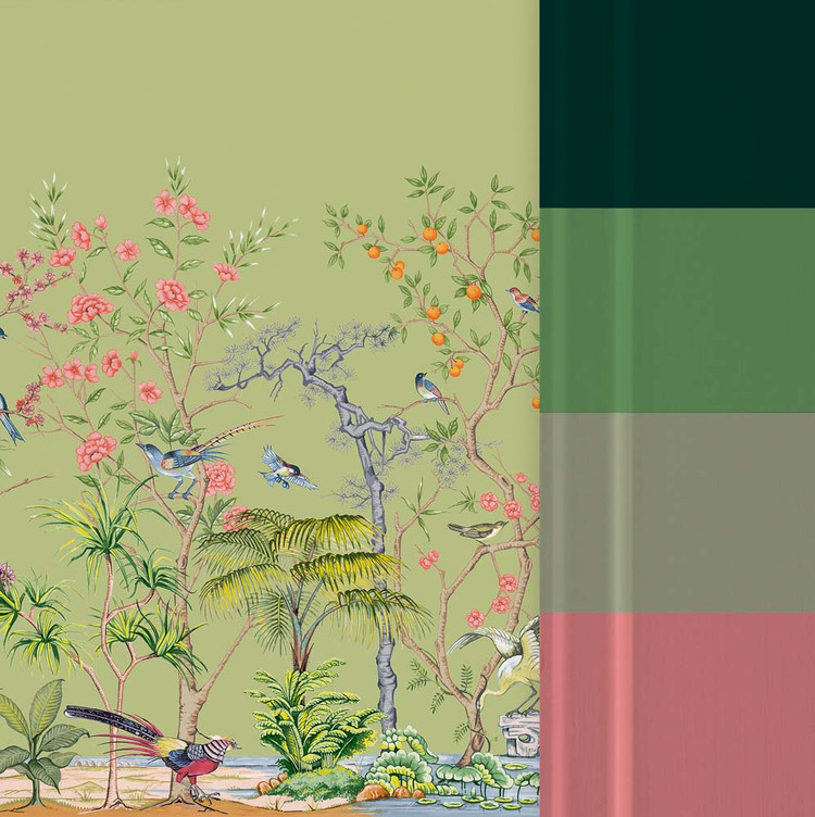 Zöld chinoiserie fotótapéta, melynek orientális stílusát a virágok és egzotikus madarak tökéletes összhangja alkotja meg izgalmas színekben. A fotótapétából áradó szépség a kelet harmóniáját jeleníti meg az enteriőrben.