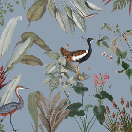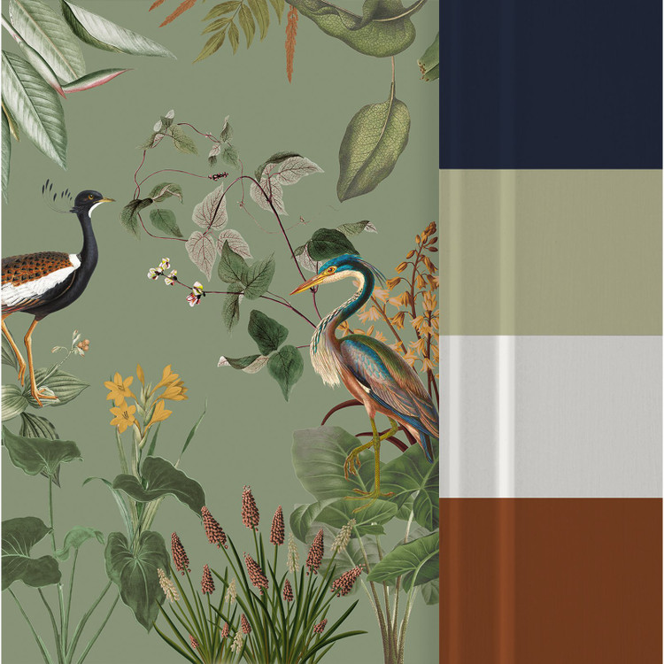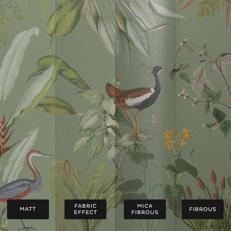 Zöld egzotikus hangulatú fotótapéta, melynek központi elemét három vízimadár alkotja. Csodálatos kompozíció, melynek egzotikus növénymintája előkelő eleganciát tükröz.