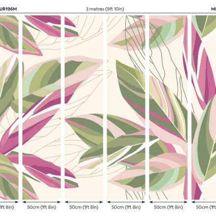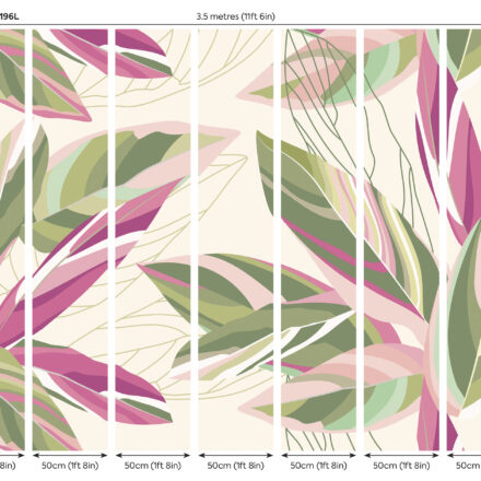 Látványos, nagy méretű levelek dekorálják a fotótapétát, melynek izgalmas színei különleges atmoszférát teremtenek az enteriőrben.