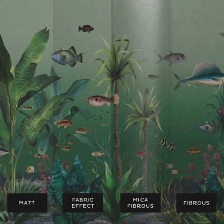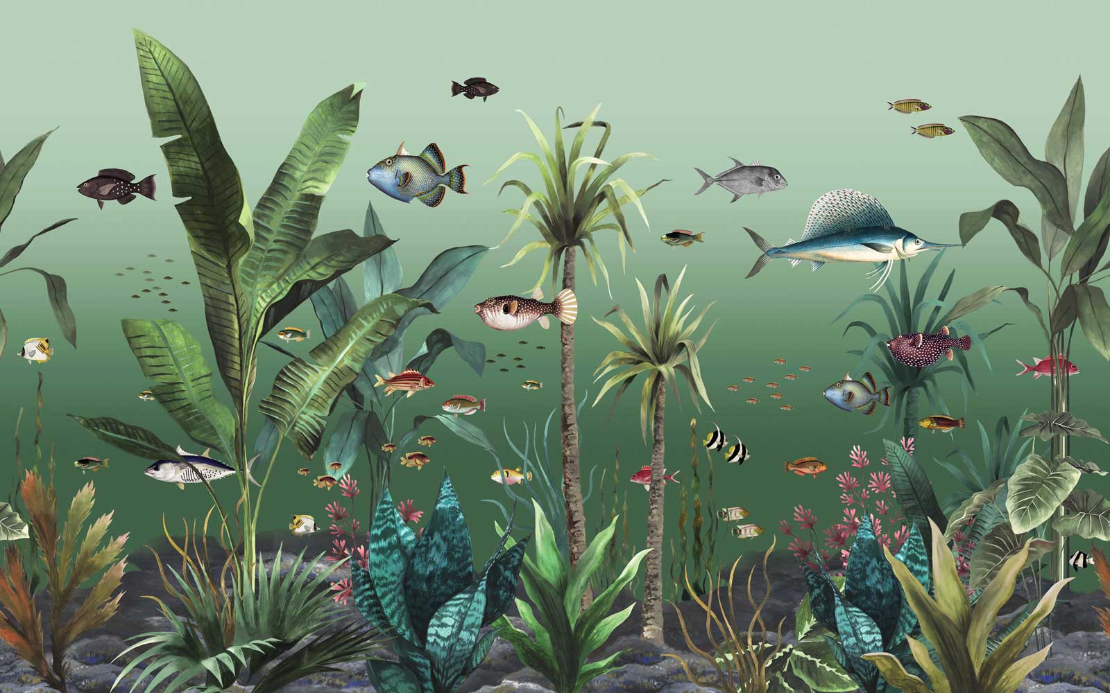 Zöld fotótapéta egzotikus halakkal, mely az óceánok misztikus világát tárja elénk. A gyönyörű növényminták között úszó halak fenséges látványt nyújtanak, mely megemeli az enteriőr hangulatát.