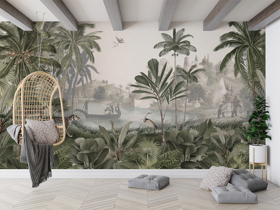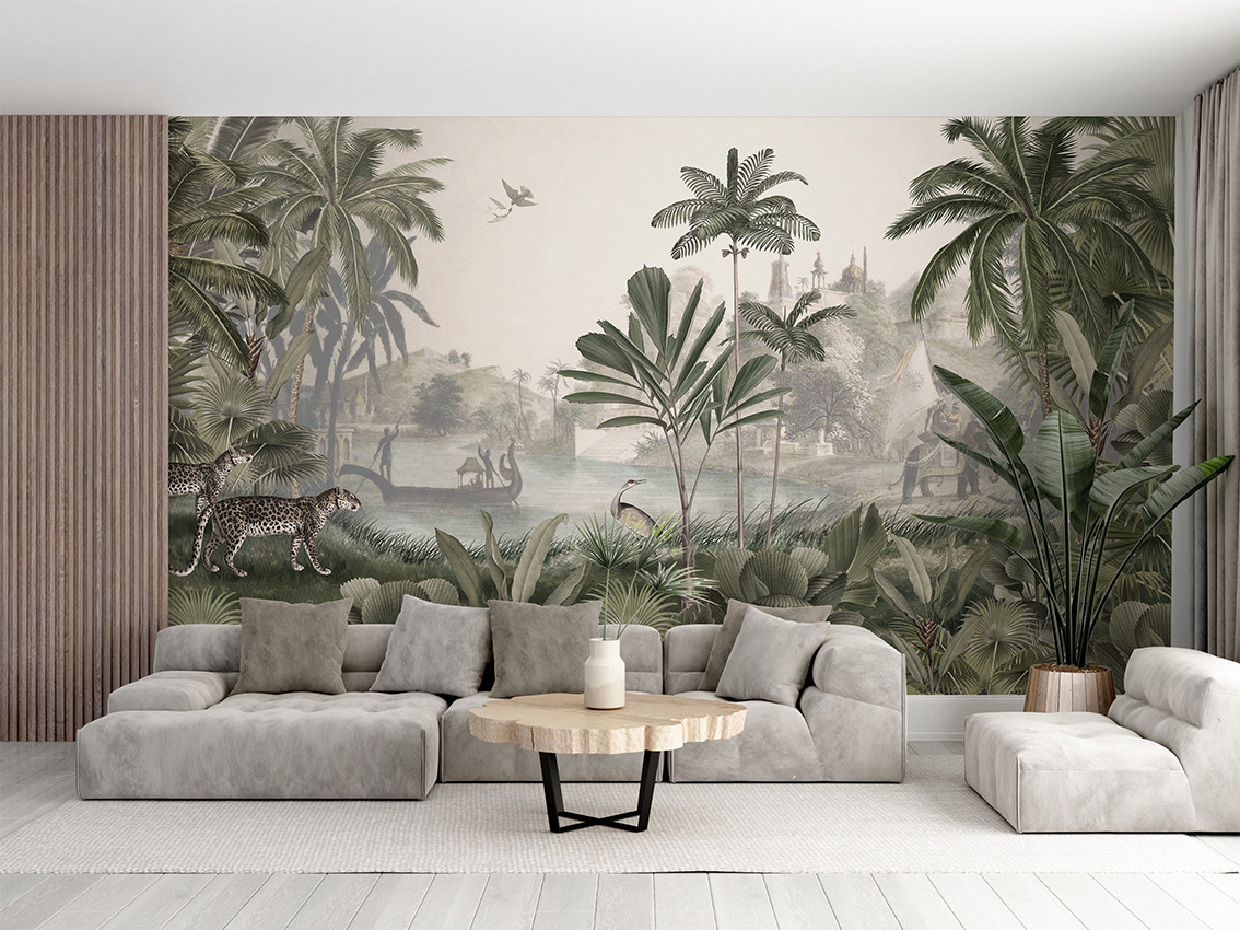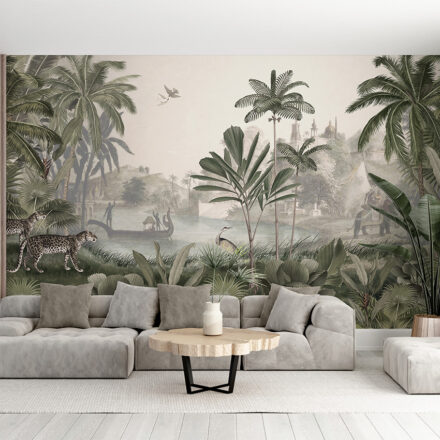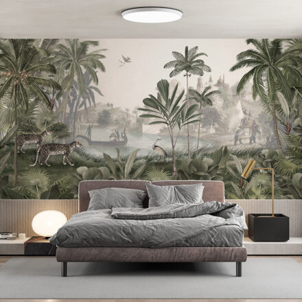 Zöld fotótapéta indiai tájképpel, melynek előterében a fenséges látványt nyújtó leopárdok jelennek meg. A háttérben meghúzódik az emberi világ, az elefánton lovagoló emberek alakja is. A tájkép fotótapéták sajátja, hogy térnövelő hatással rendelkeznek.