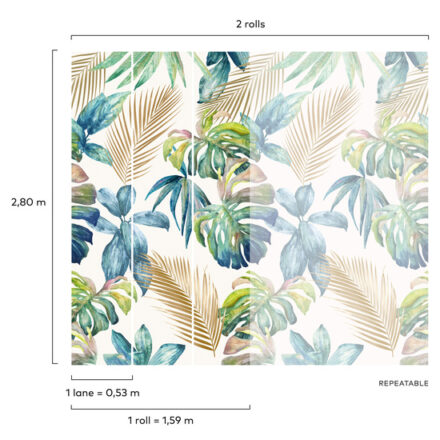 Ez a zöld–kék árnyalatokban megjelenő egzotikus levélmintás vinyl fotótapéta friss, üde hangulatot visz a térbe, miközben a természetes formák és a finoman élénk színek játékos egyensúlyt teremtenek. A pálmalevelek és trópusi növények könnyed, festett hatású megjelenése nyári, napfényes atmoszférát idéz, amely azonnal élettel tölti meg a falakat. Ideális választás, ha egy karakteres, mégis harmonikus fókuszfalat szeretnél kialakítani.