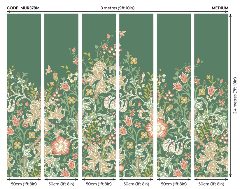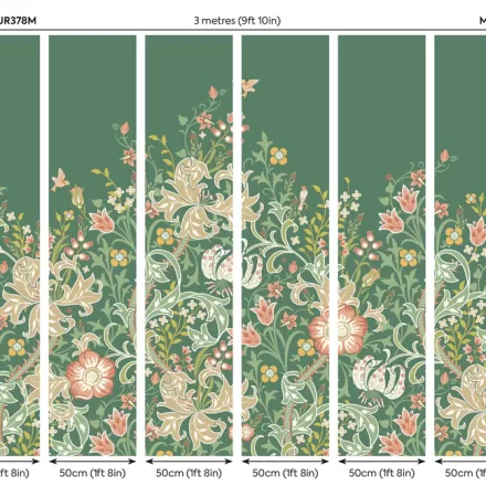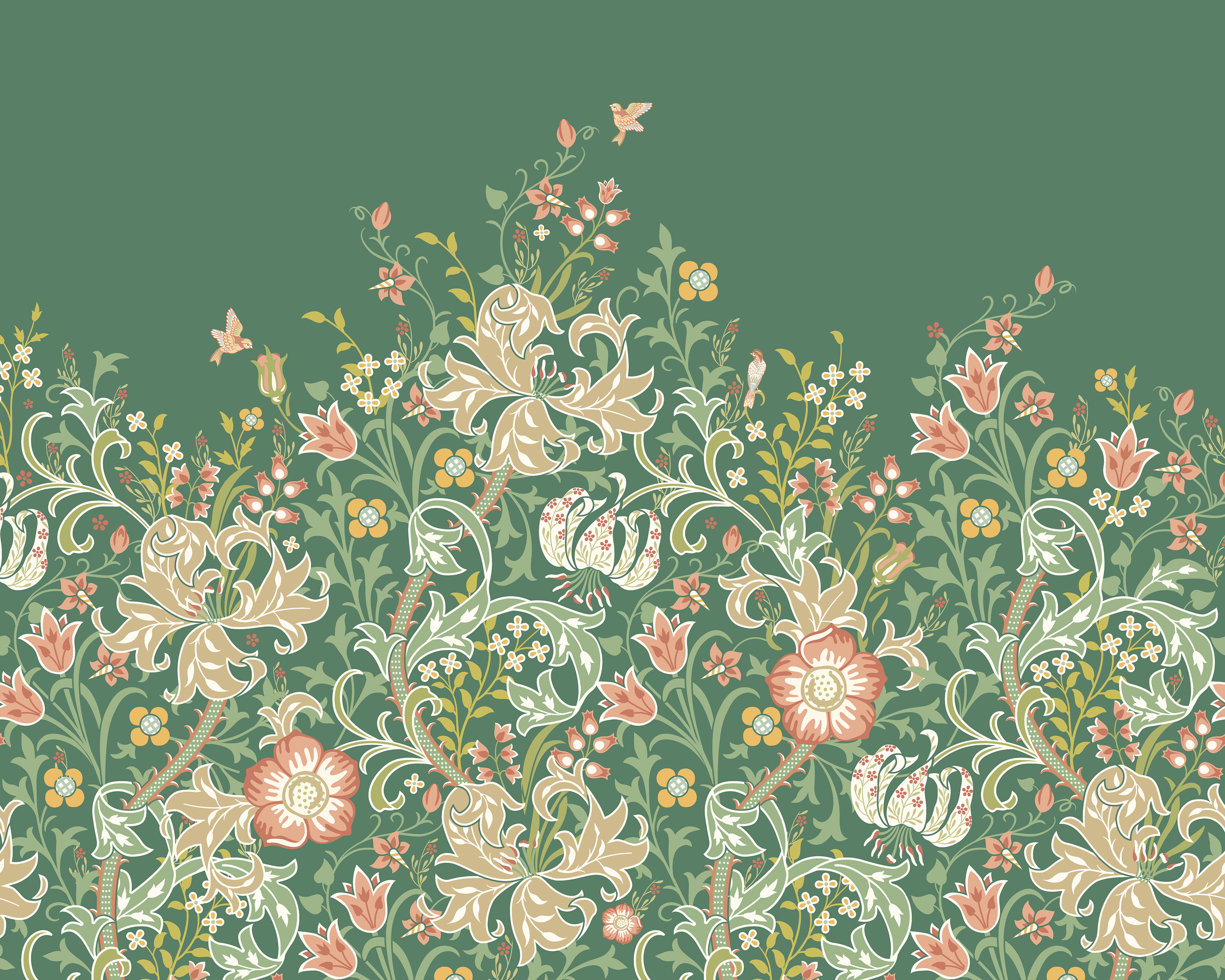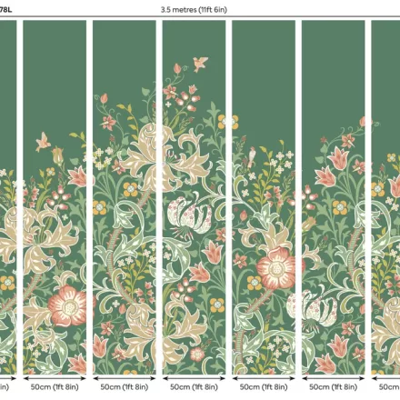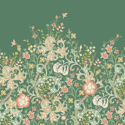 Zöld liliomvirágos fotótapéta klasszikus indamintával, melynek motívumát William Morris munkássága ihlette.