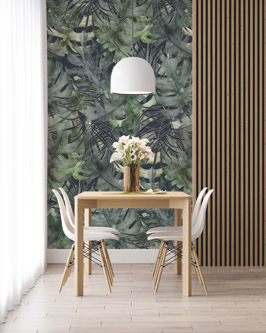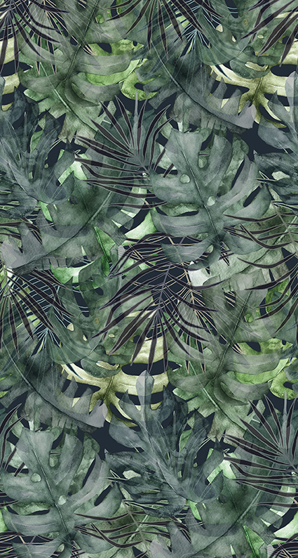 Zöld fotótapéta egzotikus pálmalevelekkel. Modern és egyben egzotikus atmoszférát teremt a sűrű levélmintás tapéta.