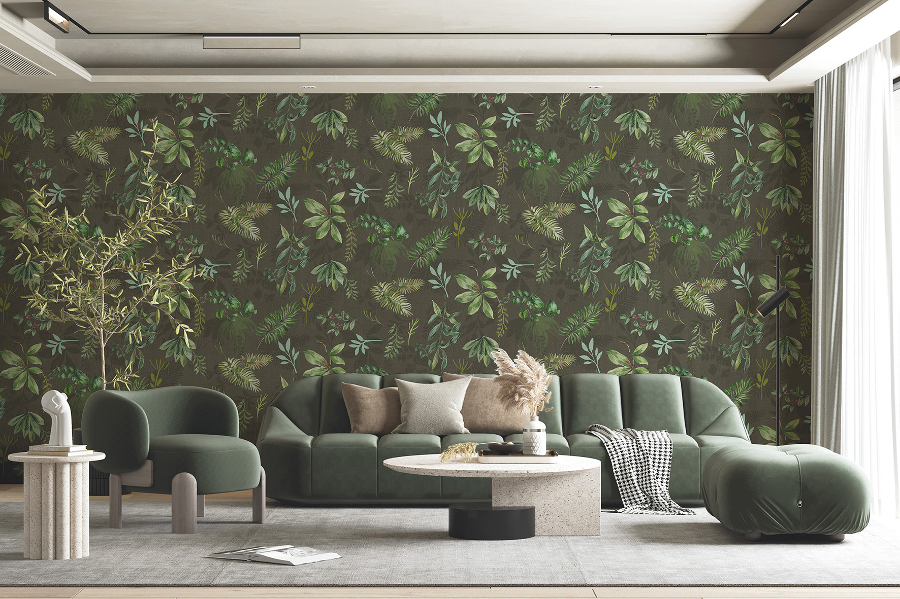 Zöld vlies poszter tapéta, melynek levelei élethű módon borítják be a falat. A falra nézve úgy érezzük, minta dús növények vennének körül minket.