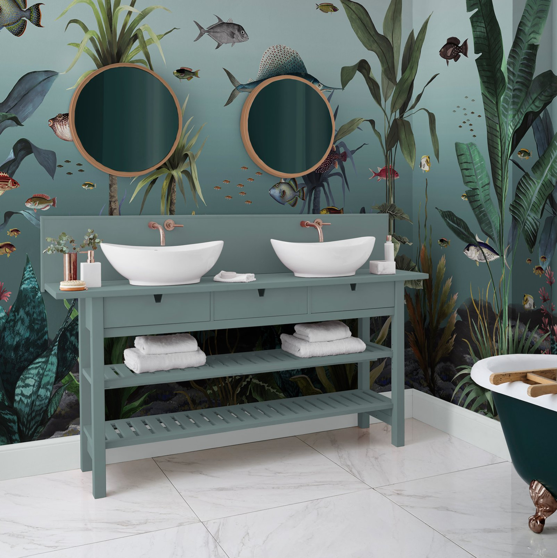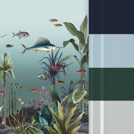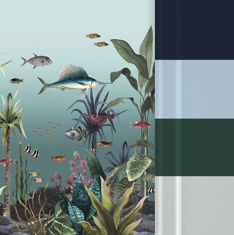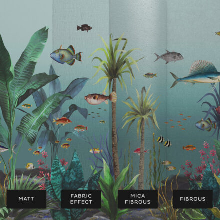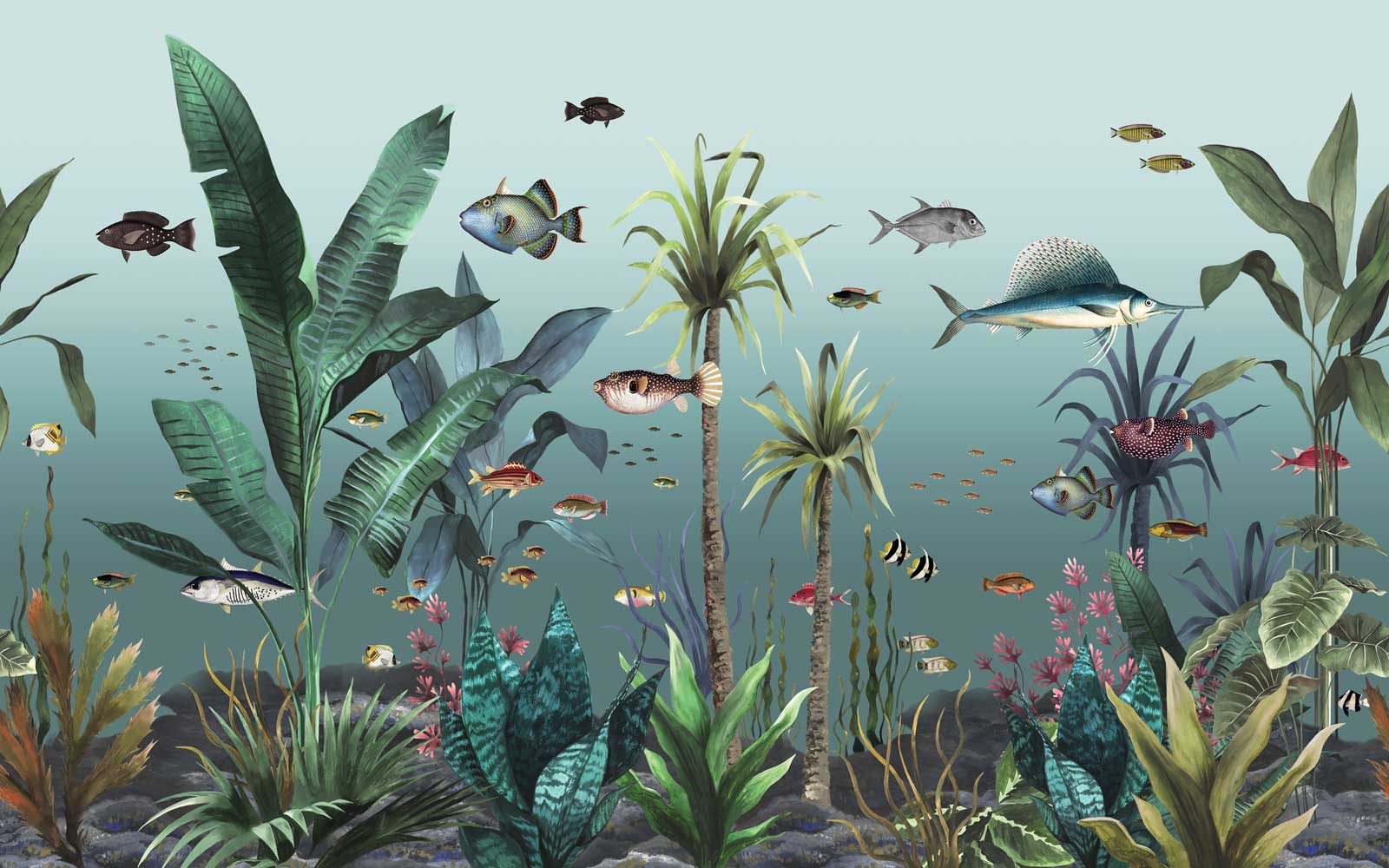 Zöldes kék fotótapéta egzotikus halakkal, mely az óceánok misztikus világát tárja elénk. A gyönyörű növényminták között úszó halak fenséges látványt nyújtanak, mely megemeli az enteriőr hangulatát.